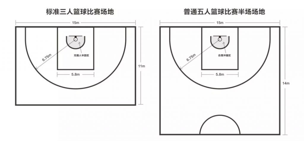 標準的三人籃球比賽場地并不是人們傳統(tǒng)意識中的普通五人籃球的半場,雖然二者寬度相同,但從比賽場地的長度來看,標準三人籃球比賽場地要比普通五人籃球的半場要短3米。(對比圖如下)